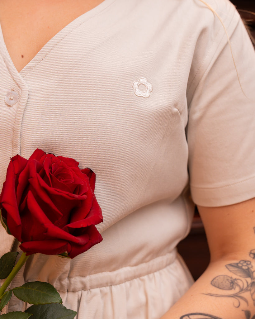 Signature fivepetal flower chest embroidery.
