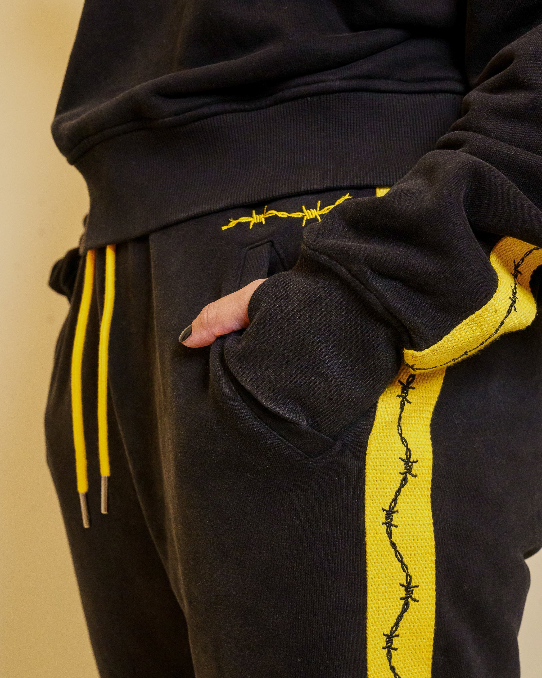Acid washing methods can cause varying degrees of bleaching. As a set, there can be a subtle but notable difference in shades between the black of the sweater and the joggers.