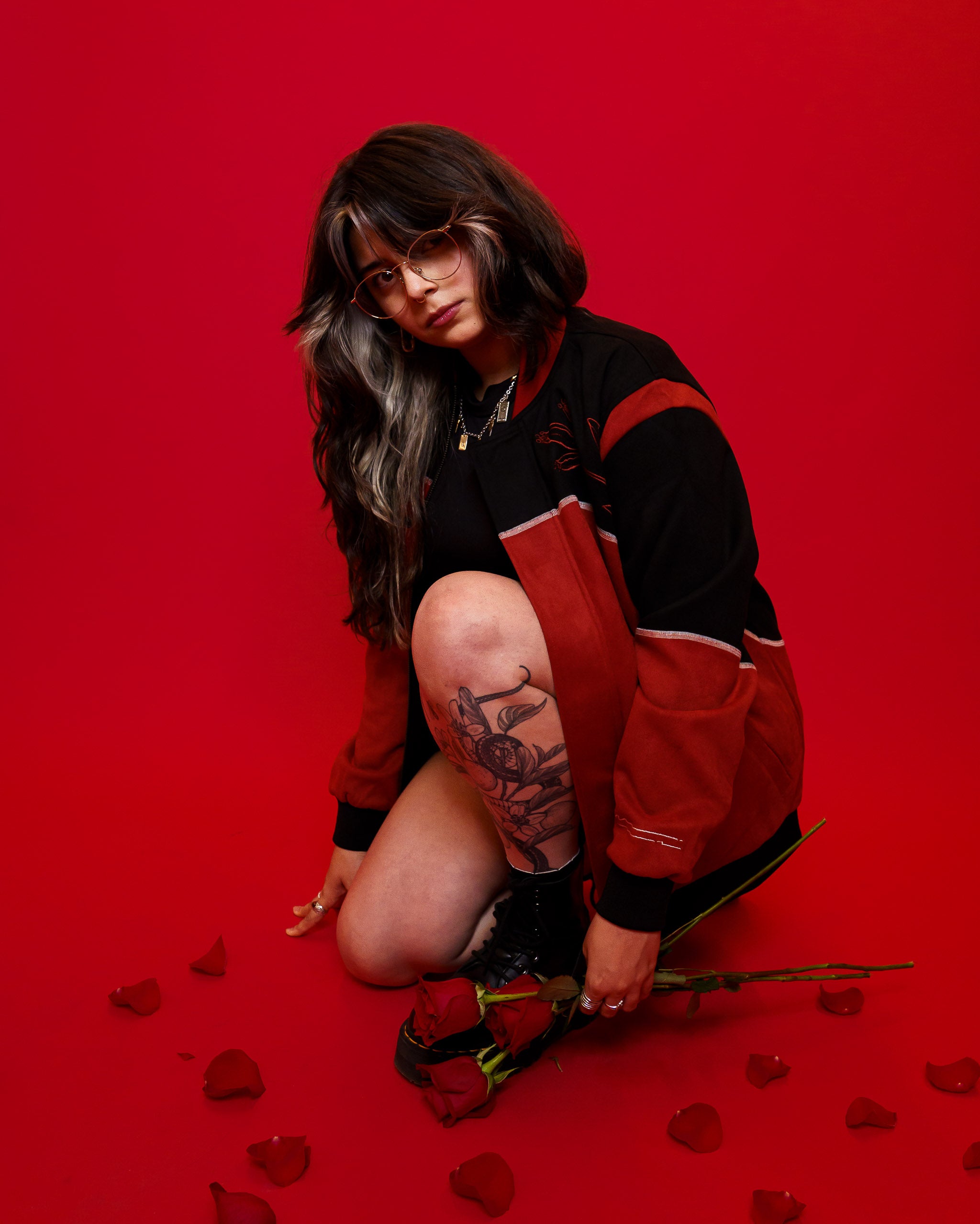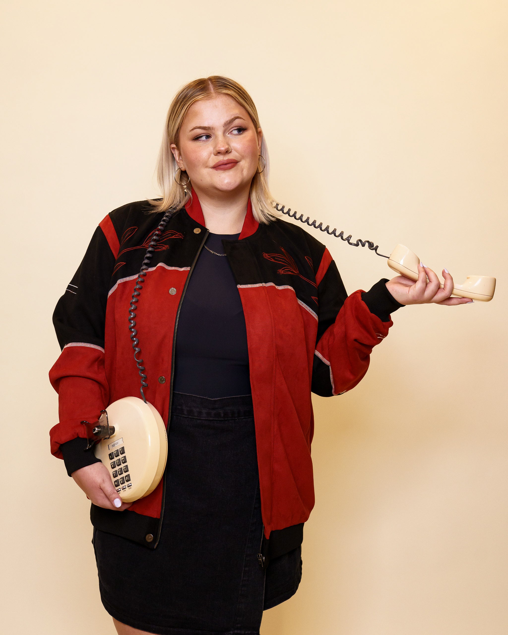 Sewn (not printed) black and red colour block