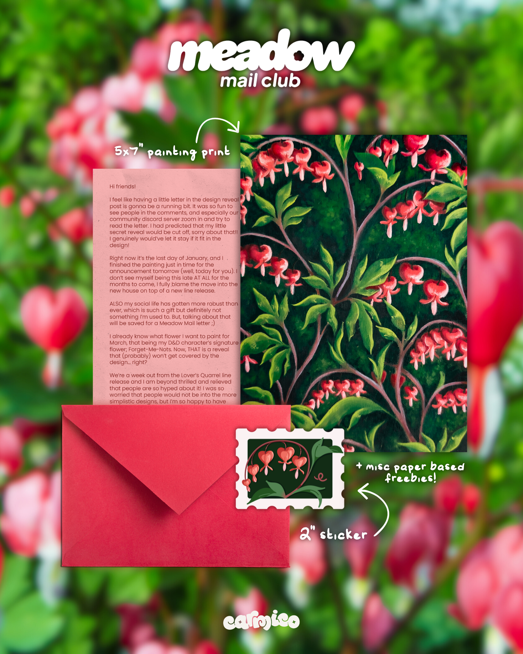 By subscribing, you will receive a 5"x7" print of a meadow-themed painting by our very own Selina, a sticker and a letter!